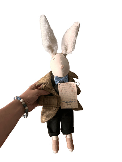 Este precioso Conejo de Trapo es una representación encantadora del icónico personaje de 'Alicia en el País de las Maravillas'. Cada puntada en su chaqueta impecable y su diminuto reloj ha sido bordada con esmero por manos artesanas de mujeres.