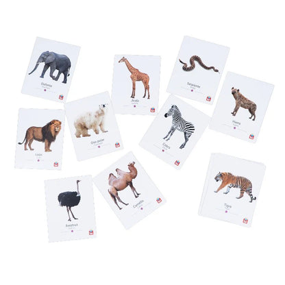 DESCRIPTION: Contains 18 cards with animals: lion, tiger, zebra, giraffe, elephant, hyena, camel, polar bear, snake, crocodile, monkey, bear, rhinoceros, wolf, kangaroo, bison, crocodile, ostrich, hippopotamus.