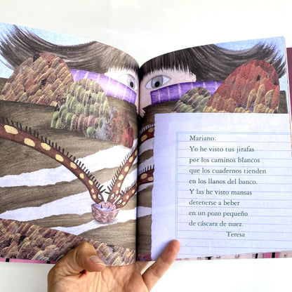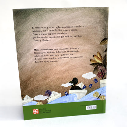 El maestro, muy serio, explica una lección sobre la carta. Mientras, por el salón desfilan aviones, navíos, flores y jirafas, papelitos que viajan por los mundos imaginarios que habitan y escriben Teresa y Mariano.