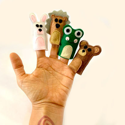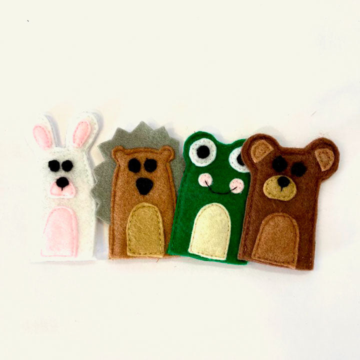 Cuatro títeres de dedito hechos a mano en fieltro, pueden llenar de sonidos e historias un tiempo presente entre niños y adultos. El dedo pulgar podría ser un conejito y el anular una rana. ¿Dónde pondrías el oso y el puercoespín? Estos pequeños y livianos títeres que caben juntos en la palma de la mano son perfectos para llevarlos en la pañalera o el bolso a cualquier viaje o restaurante y activar la imaginación en lugares y tiempos de espera.