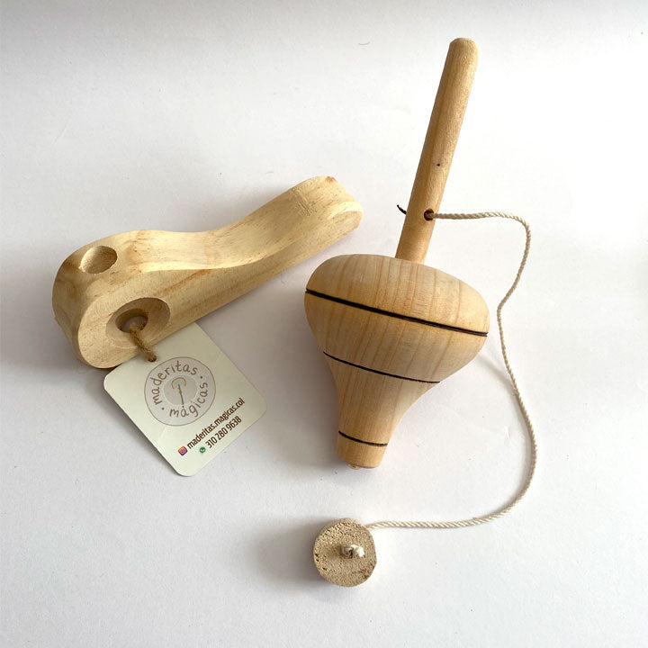 DESCRIPCIÓN: Trompo en madera con lanzador y cuerda.