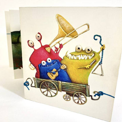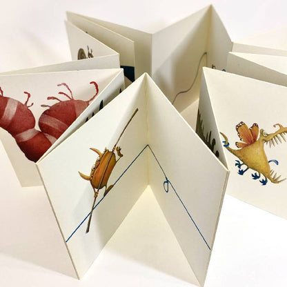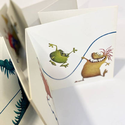 Yipo nos parece un libro sin fin. De esos a los que tienes que darle la vuelta varias veces para descubrir dónde empieza y dónde termina. En los que en cada página descubres una historia con nuevos detalles, que se conecta con la anterior y con la que sigue. En la que unos monstruos que no dan miedo, sino más bien gracia se enlazan con una lana que se teje y se desteje.