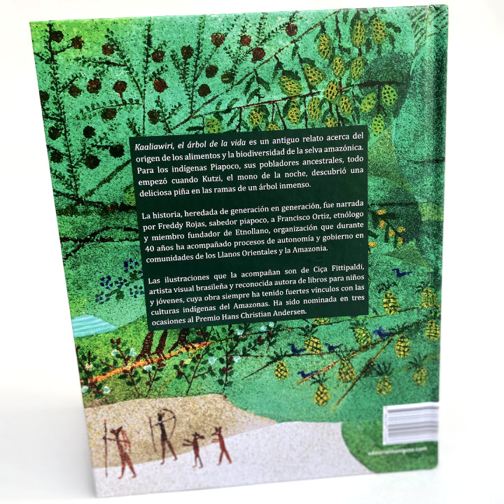 Kaaliawiri, el árbol de la vida es un antiguo relato acerca del origen de los alimentos y la biodiversidad de la selva amazónica. Para los indígenas Piapoco, sus pobladores ancestrales, todo empezó cuando Kutzi, el mono de la noche, descubrió una deliciosa piña en las ramas de un árbol inmenso. Aunque todos querían probrarla, solo él sabía dónde encontrarla.