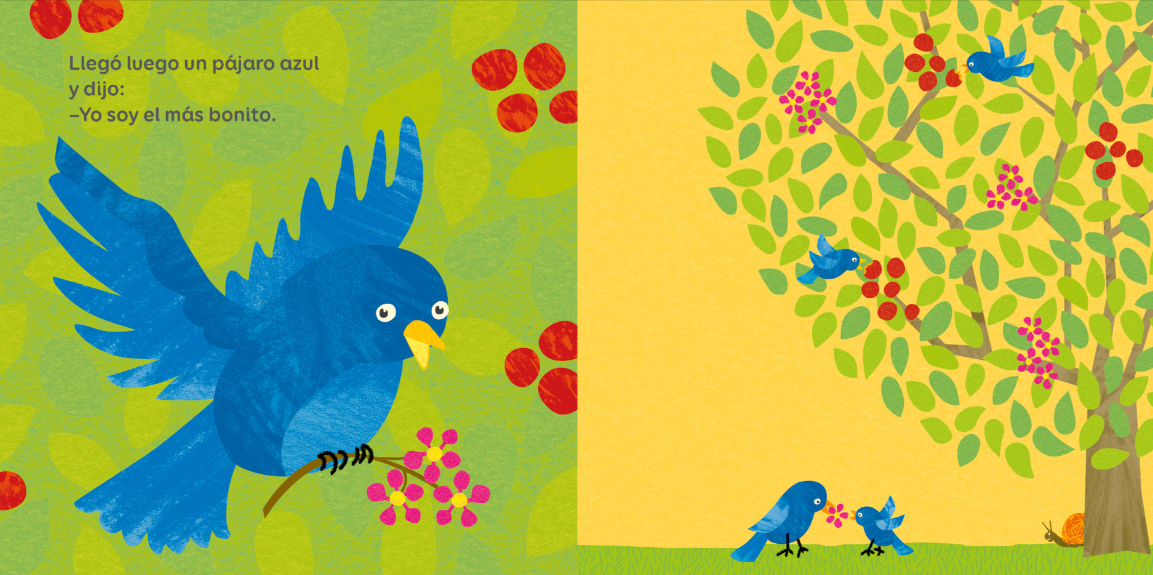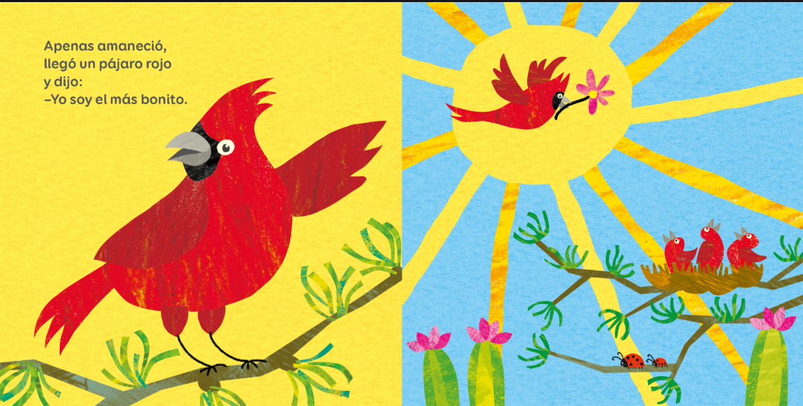 Este libro cuenta la historia de una competencia de aves por ser la más linda, pero para sus hijos, al final del día todos se juntan para disfrutar la serenidad del sueño sin importar a cuál nido pertenece cada cría. En la noche los colores se diluyen en el silencio.